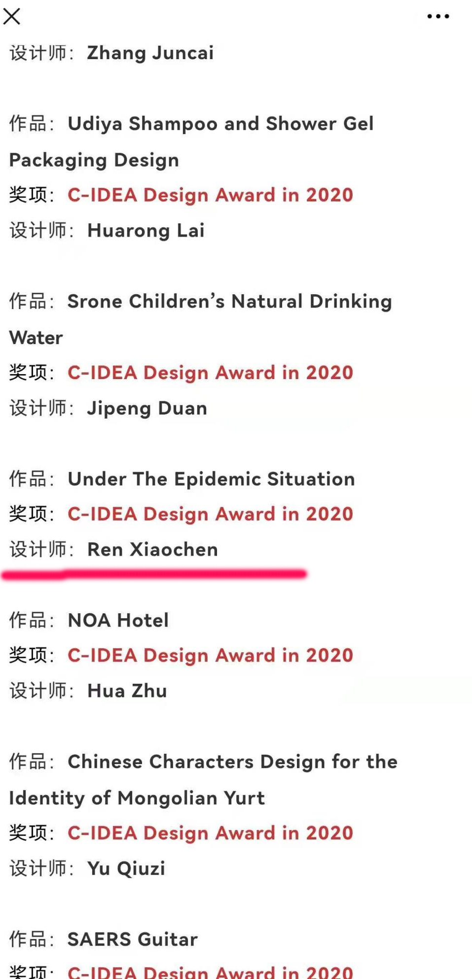 第三轮作品终评由C-IDEA设计奖国际组织委员会-韩国视觉信息设计协会所组成的专家评委会在韩国进行了现场评审。由C-IDEA设计奖国际组委会主席大卫·布莱克洛克组织的国际设计专家在澳大利亚对终评评审结果进行了再次评议。最终评选出了2020年C-IDEA设计奖获奖者以及2020年C-IDEA设计奖大奖、金奖得主。经过激烈的奖项角逐,我校青年教师任晓辰的作品荣获C-IDEA设计奖,7月获奖作品将在韩国首尔斗星纸业美术馆展出,9月将在波兰波兹南设计节上展出。