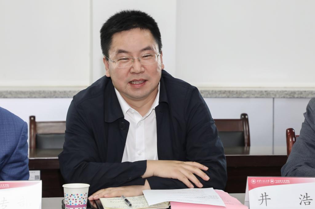 最后,校党委副书记井浩总结讲话。他指出,学校将全方位大力支持马克思主义学院建设。同时,他提出:第一,要深刻领悟、不折不扣地贯彻中央加强马克思主义学院建设的战略意图,确保马克思主义理论指导贯穿教学、科研和人才培养的全过程,努力使马克思主义成为青年学生坚定的政治信仰和自觉的价值追求。第二、要旗帜鲜明、理直气壮地支持马克思主义学院建设,确保马克思主义学院第一学院和思想政治理论课第一课程的重要地位,以等不起、慢不得、坐不住的责任感、紧迫感,努力把马克思主义学院建设成为高质量的教学育人基地、理论研究高地、思想宣传阵地。第三、要切实有效、与时俱进地推动思政课改革创新,确保思政课的思想性、理论性和亲和力、针对性,找准切入点、聚焦点、结合点,沿用好办法、改进老办法、探索新办法,努力引导学生在科学思想理论指导下明辨是非曲直,在严谨的学术探讨中明确使命担当。第四、要坚持不懈、用心用力地配齐建强思政课教师队伍,改进评价标准、加强教育引导、严肃准入退出,努力打造一支政治要强、情怀要深、思维要新、视野要广、自律要严、人格要正的高素质思政教师队伍。第五、要统筹优化、整合凝练学科方向,把准学科定位,以特色求生存,以特色谋发展,以特色争优势,以学术研究助推学科进步,在夯实马克思主义理论学科教学研究基础上,打破同质化,努力形成具有学校自身品质和优势的学术研究与学科建设方向。要加强高水平学习交流,拓展学科发展视野、拓宽学术发展格局,坚持“走出去、请进来,找差距、学经验”,强化与政府和校际间的交流与合作,把握前沿动态、激发创新思路、争取政策支持,以多种形式有力、有效助推专业建设、学科建设、队伍建设。(撰稿:杨柳 审稿:杨永革 王志)