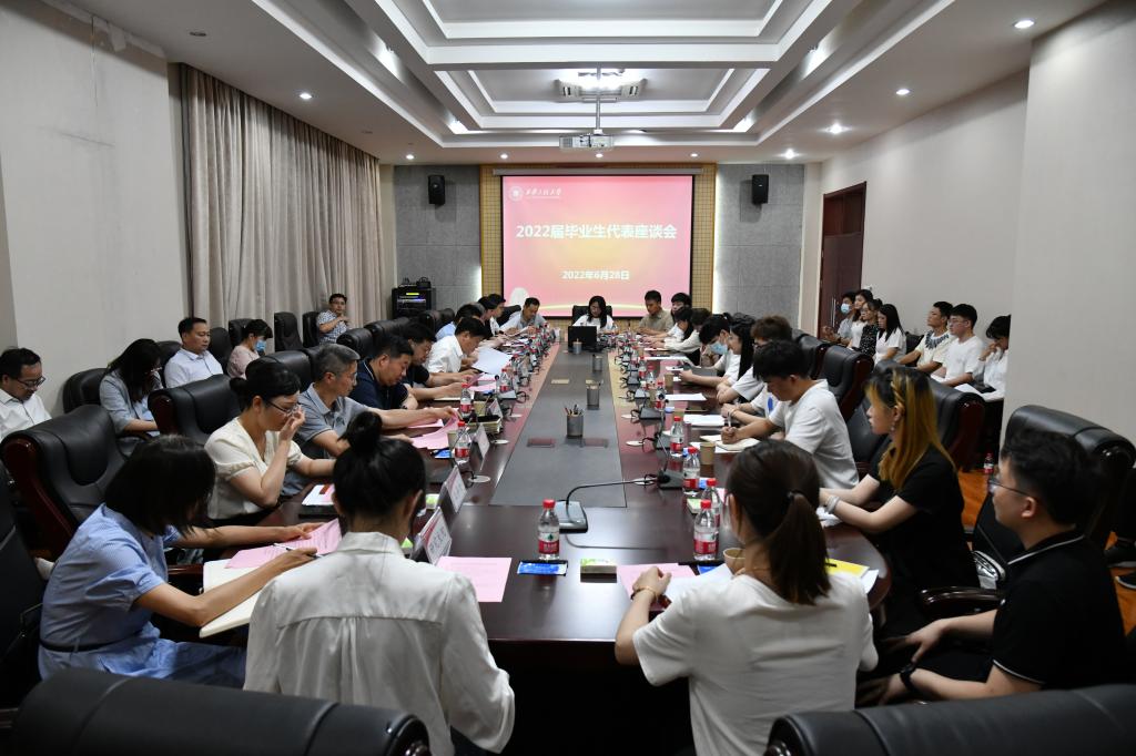 2022年6月28日下午,临潼校区图书馆一楼会议室掌声阵阵、气氛热烈感人,我校2022届毕业生代表座谈会在此隆重召开,师生们围坐一堂,殷殷话别,深情寄语。校长王海燕出席并讲话,校党委副书记赵小峰主持,副校长朱永民、殷永建、戴鸿出席。党政办公室、学生工作部(处)、研究生工作部、校团委、教务处、研究生院、招生就业工作处、后勤管理处、网络与信息化管理处、保卫处、图书馆、体育部等部门负责人及26名毕业生代表参加座谈。
